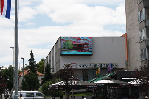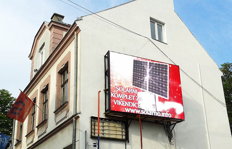 LED displej, veličine 6 metara kvadratnih, vrhunske rezolucije P10 u SMD tehnologiji izrađen, postavljen na centralnom gradskom trgu, Trgu Majora Zorana karlice na visini koja je optimalna za pogled kad se prelazi ovim trgom. Ovim trgom po procjenama dnevno prođe preko 20.000 ljudi.